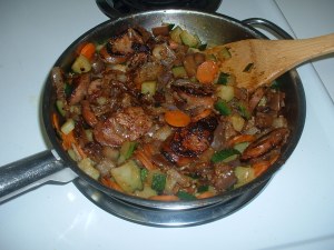 - Add last tbsp of oil to pan of juices; mix in zucchini, distributing oils evenly. Cook only until tender, stirring occasionally; watch so it doesn’t get mushy. While cooking, go to next step. (Note: may have to add more water to stock pot, so it is 2/3’s full, and boiling.)