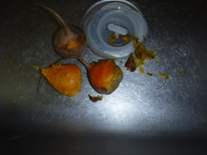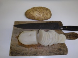 - Cut the potato in halves or thirds. Place it in boiling water and cook it until soft, but firm-not so much that it will fall apart. Discard the water and cool. (May do this the day before.)