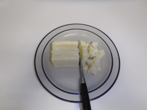 Easily cut cold butter into small pieces, by cutting stick in fourths length-wise; keeping cube in tact, rotate this stick and cut in fourths again; then, shave small pieces off end. See photo below.