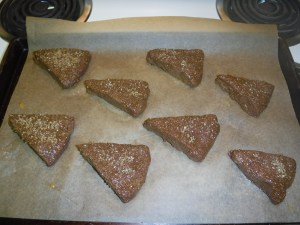 - Pat out into a 7” round; cut into eighths. Holding individual scones in hand, brush top and sides of each with egg wash and sprinkle top with crystallized sugar. Place on parchment-covered pan (see photo at top of recipe).