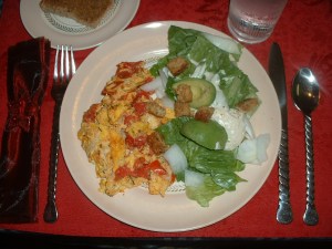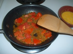 - Add beaten eggs, and cook to a soft scramble, set aside.