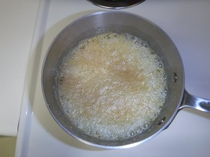 To proceed with ghee, however, cook butterfat until a second foam rises, and it is golden in color. This will take 2-3 more minutes, and temperature will reach 250 degrees. Watch carefully as dry casein particles, settled on bottom of pan, will brown quickly. See photo.